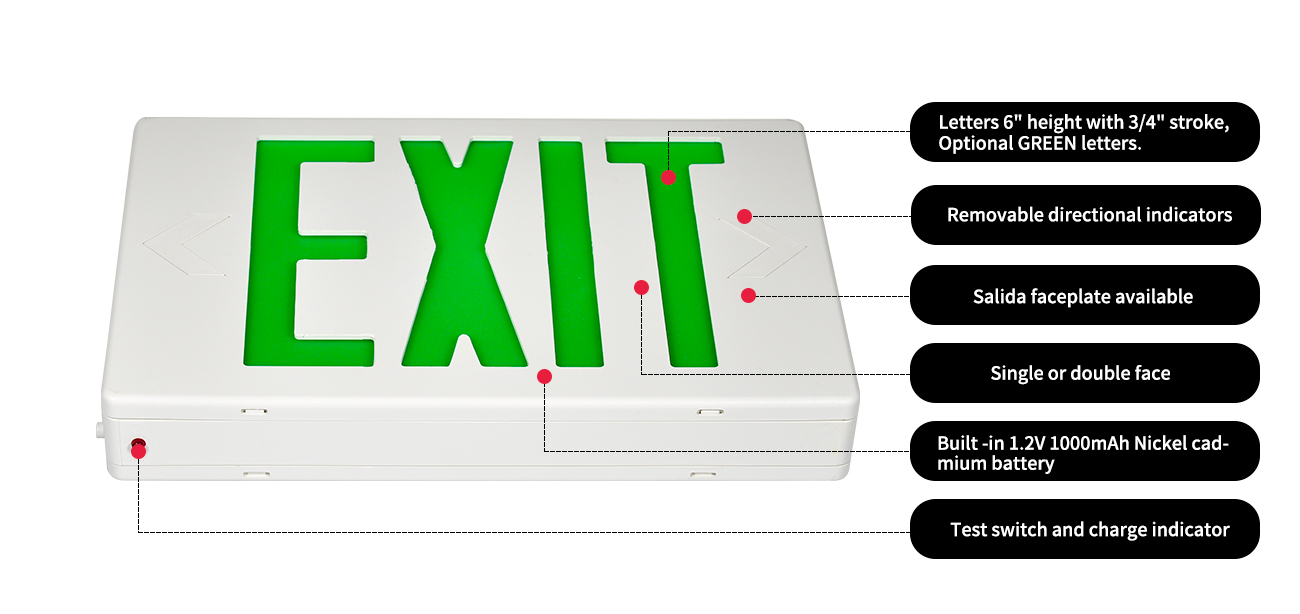 *Valaistus - LED -poistumismerkkisarjan valaistus saavutetaan käyttämällä pitkäaikaisia, tehokkaita erittäin kirkkaanvihreitä LED -levyjä. Väri-sovitettu hajotin eliminoi hots-pisteet ja striaatiot tarjoamalla optimaalisen valonlähtöä.