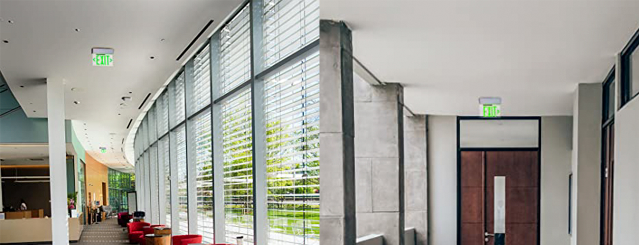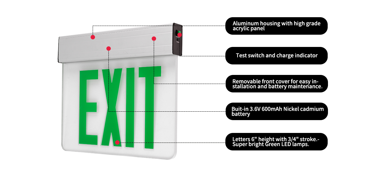 *Valaistus - Tämä reunan valaistu Exit Sign -sarja tarjoaa pitkän elämän LED -valaistuksen. Yksikkö on rakennettu vihreän korkean ulostulon LED -levyllä.  Energiankulutuksen arvioidaan olevan alle 3,5 wattia vain AC -malliyksiköille. Akun varmuuskopioyksiköt energiankulutus on alle 1 watin.